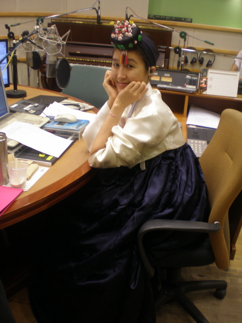방송인 홍진경이 16강 진출에 한복에 족두리를 쓰고 라디오를 진행했다.