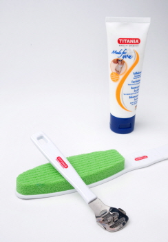 딱딱하고 두꺼운 뒤꿈치 각질 제거에는 면도기인 티타니아 크레도(\10,000)를 사용하면 안성맞춤이다. 까칠까칠한 각질엔 티타니아 샌드풋파일(\6,000)로 살살 문지르면 발각질들이 하얗게 떨어져 나온다. 각질 제거 후엔 발을 씻고, 보습효과를 위해 풋발삼크림(\15,000원/75ml)을 발라준다.