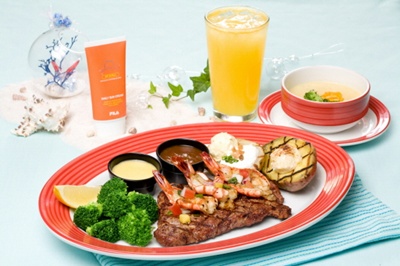 이 메뉴는 애피타이저인 스프와 함께 새롭게 선보이는 ‘스테이크& 쉬림프 듀엣’과 에이드로 구성돼 있으며, 사이드 메뉴로 ‘통 감자’와 ‘통 고구마’를 구성했다. 또 세트 메뉴 주문 시 여름 필수 아이템인 선 크림을 제공한다.