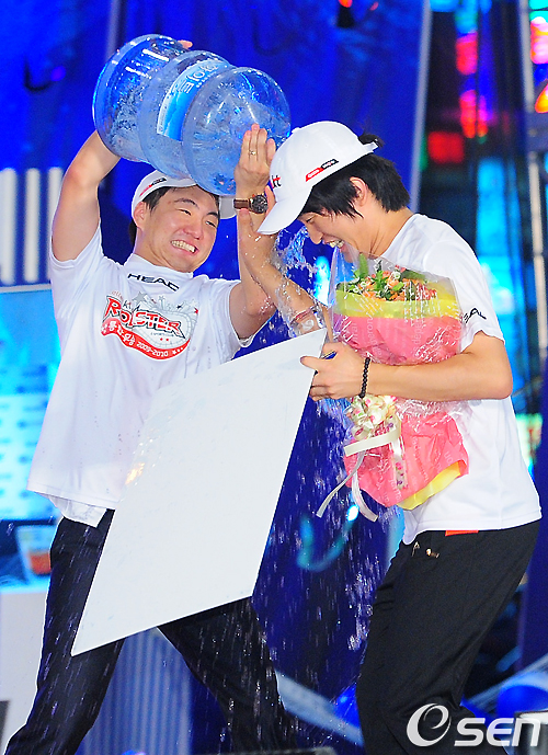 KT 이지훈 감독이 MVP를 수상한 이영호에 물세례를 하고 있다. /jpnews@osen.co.kr