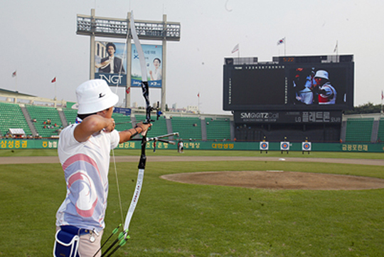 대한양궁협회는 오는 25일 오후 4시부터 50분간 잠실야구장에서 LG-삼성전에 앞서 광저우 아시안게임을 대비한 대표팀 특별 훈련을 실시한다.
