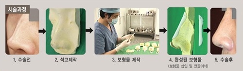 이러한 맞춤형 보형물은 미간과 콧대에만 위치하도록 그 길이를 최소화하는 것이 바람직하다. 그리고 코끝은 연골재배치와 자가연골이식으로 높이게 되면 안전하면서도 자연스러운 코가 완성된다.