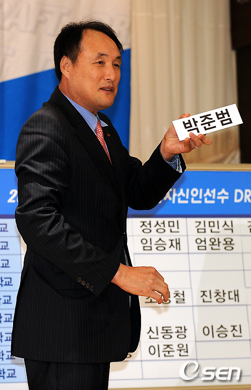 28일 오전 서울 청담동 호텔 리베라에서 열린 프로배구 2010~2011시즌 남자 드래프트 1라운드에서 KEPCO45 강만수 감독이 박준범을 지명한뒤 이름 팻말을 보이고 있다.