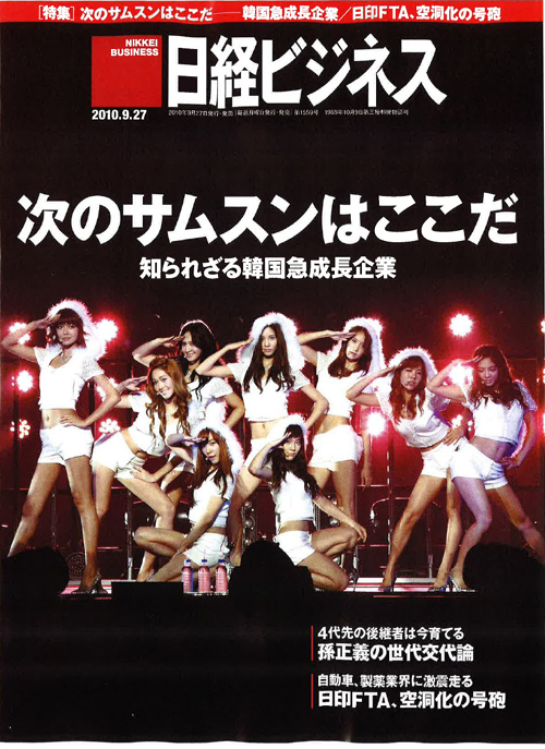 닛케이 비즈니스는 지난 27일 발행한 1559호의 표지에 경제주간지로서는 이례적으로 소녀시대의 사진을 게재했다. 이 주간지는 소녀시대 사진과 함께 “한국의 성장 기업이 소녀시대와 닮았다”는 분석을 커버스토리를 다뤘다.