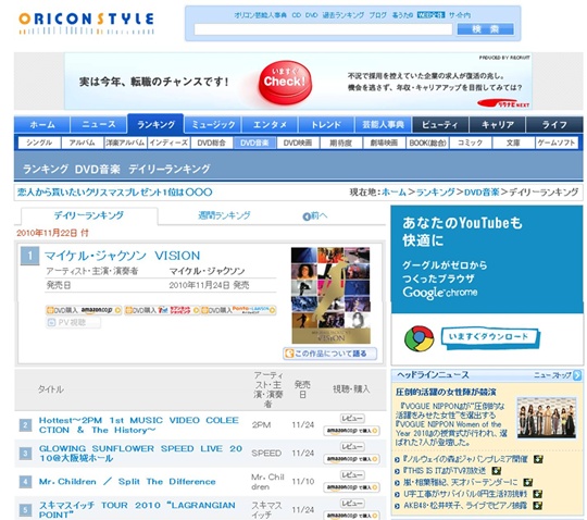같은 날 마이클 잭슨의 DVD가 발매되었음에도 불구하고 당당히 차트 2위에 오른 2PM은, 뿐만 아니라 금주 일본 최대 모바일 벨소리 사이트 ‘레코쵸크’의 일간차트에 이어 주간차트에서도 1위부터 5위를 휩쓰는 저력을 보여 다시 한번 현지 관계자들을 놀라게 했다.