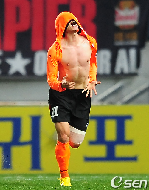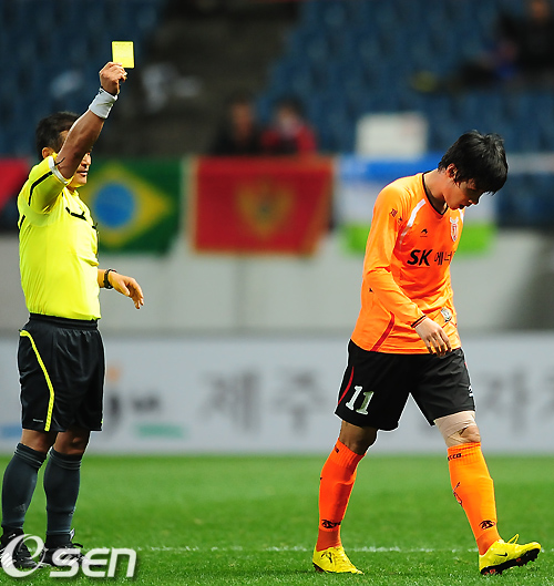 <사진> 배기종이 선제골을 터뜨리고 웃통을 벗어올려(위) 이상용 주심으로부터 옐로카드를 받고 있다. / 서귀포=민경훈 기자 rumi@osen.co.kr
