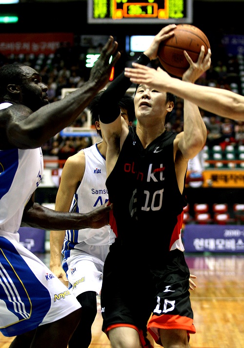 광저우 아시안게임의 스타 조성민(KT)이 대표팀서 한솥밥을 먹었던 이승준(삼성)과 맞대결서 우위를 점하며 팀을 승리로 이끌었다.