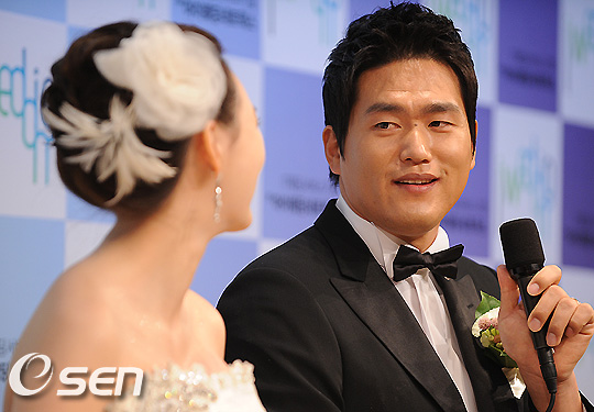 예식에 앞서 열린 기자회견에 참석한 최희섭이 예비신부 김유미씨를 바라보고 있다. /soul1014@osen.co.kr