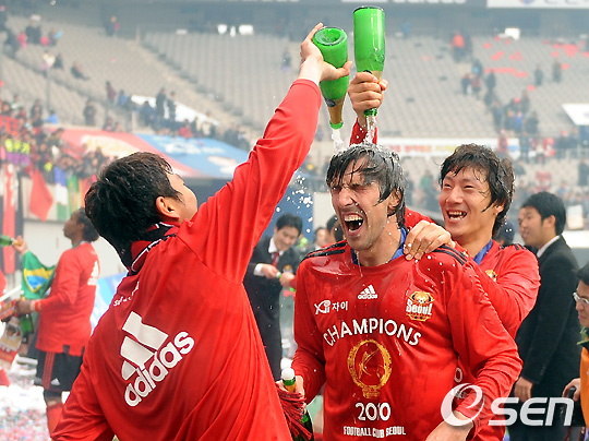 경기 종료 후 데얀이 샴페인을 맞으며 환호하고 있다. soul1014@osen.co.kr