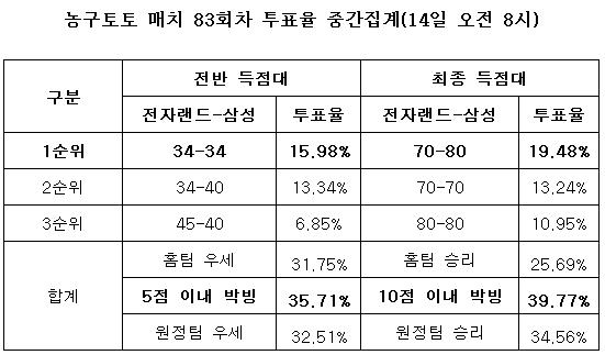 홈팀 전자랜드의 승리를 예상한 참가자는 25.69%로 집계됐고, 나머지 34.56%는 원정팀 삼성의 승리를 전망했다. 전반전 역시 양팀의 5점 이내 박빙승부가 35.71%로 가장 높게 집계됐고, 홈팀 전자랜드 우세(31.75%), 원정팀 삼성 우세(32.51%)가 근소한 차이로 뒤를 이었다. 전반 득점대의 경우 34-34점대가 15.98%로 1순위를 차지했고, 최종 점수대에서는 70-80점대 삼성 승리가 19.48%로 최다를 차지했다.