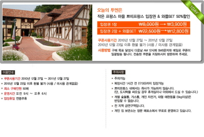 새롭게 론칭한 소셜 커머스 투게더엔젤이 드라마 ‘시크릿가든’ 및 ‘베토벤 바이러스’의 촬영지로 유명한 쁘띠프랑스 입장권을 파격적인 가격으로 판매한다.