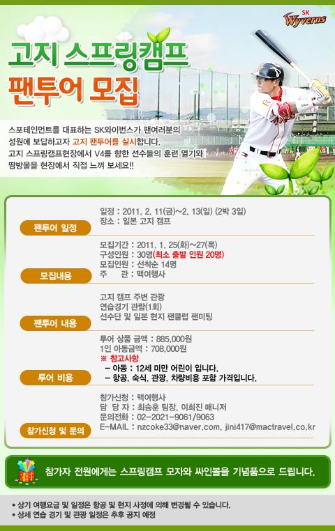 이번 팬 투어는 내달 11일부터 13일까지 2박3일간 SK 선수단의 스프링캠프를 직접 체험하는 여행 상품으로 88만 5000원에 30명으로 구성될 예정이다.