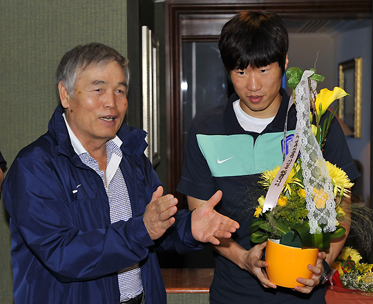 26일 숙소인 카타르 도하 매리어트 호텔에서 가진 행사에는 대한축구협회 조중연 회장이 보낸 가입 축하 화분이 이회택 부회장을 통해 박지성에게 전달됐다.