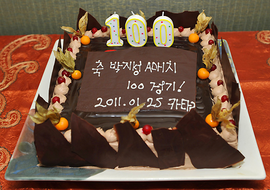 박지성은 대표팀서 준비한 100경기 출전 축하케이크를 커팅했고 조광래 감독을 비롯한 전 선수단이 박수로 축하했다. 축구협회 관계자는 "박지성은 모두에게 도와줘서 감사하다는 인사를 전했다"고 밝혔다.