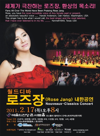 로즈장은 2월17일 오후 8시 박상현이 지휘하는 모스틀리 필하모닉 오케스트라와 함께 콘서트를 갖는다. 세계가 극찬하는 환상의 목소리로 알려진 로즈장은 국내팬들에게 뜨거운 감동을 전해 줄 것으로 기대된다.