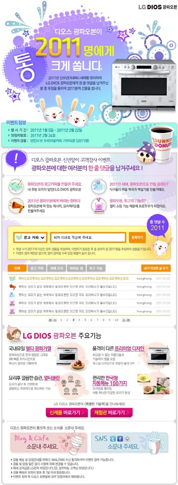 LG전자 설맞이 이벤트인 ‘2011명에게 통 크게 쏩니다’는 광파오븐의 광고카피나 최고의 기능, 바라는 한마디, 광파오븐으로 만들 요리 등 다양한 의견을 댓글로 등록하면 총 2011명을 추첨해 던킨도너츠 오리지널커피 기프티콘을 제공한다.