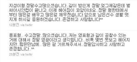 대표팀의 막내 손흥민(19, 함부르크)이 자신의 트위터를 통해 대표팀 은퇴를 선언한 이영표(34, 알 힐랄)과 같은 방을 쓴 박지성(30, 맨체스터 유나이티드)에게 감사의 마음을 전했다.