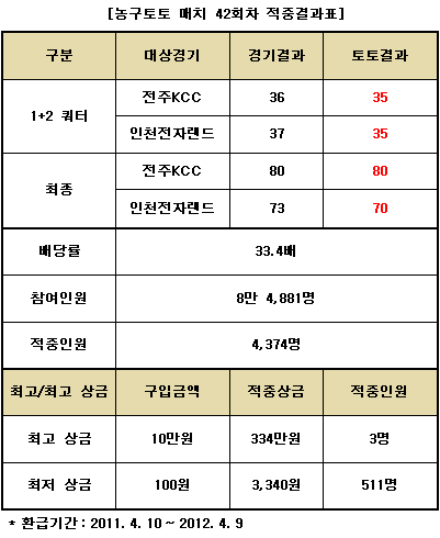 국민체육진흥공단(www.kspo.or.kr)이 발행하는 체육진흥투표권 수탁사업자인 스포츠토토는 지난 9일(토) 열린 KCC와 전자랜드의 프로농구 4강 플레이오프전을 대상으로 한 농구토토 매치 42회차 게임에서 총 4천374명의 적중자가 나와 각각 베팅금액의 33.4배에 해당하는 적중상금을 받게 됐다고 밝혔다.