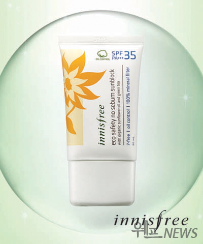 이니스프리 ‘에코 세이프티 노 세범 선블록’은 번들거림이나 끈적임 없는 보송보송한 마무리감이 특징이다. 피지 흡착 및 컨트롤 능력이 뛰어난 미세 파우더가 땀과 피지를 조절해 하루 종일 산뜻하게 피부를 유지 시켜준다. 특히 100% 미네랄 필터를 사용해 화학적 자외선 차단제에 민감한 피부에도 순하게 사용할 수 있다.
