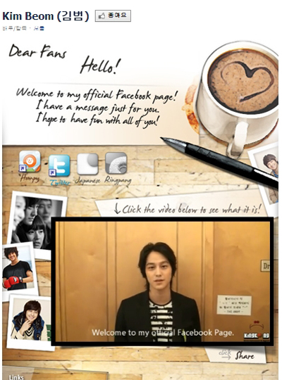 김범은 자신의 ‘페이스북’을 통해 “전 세계 팬들과 가까워지고자 공식 페이스북을 만들게 되었다. 재미있는 모습과 최신 소식들을 전하겠다. 많은 관심을 부탁한다”며 영상을 통해 인사를 전했다.