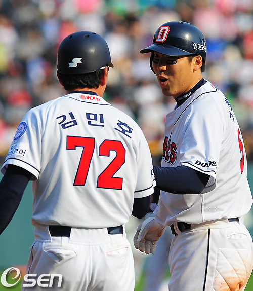 5일 오후 서울 잠실구장에서 열린 '2011 롯데카드 프로야구' 두산 베어스와 LG 트윈스의 경기 7회말 무사 1,3루 두산 김현수가 내야땅볼을 날렸다. 타구를 LG 1루수 서동욱이 홈으로 송구했으나 3루 주자 정수빈은 세이프. 김현수가 안도의 한숨을 쉬며 김인호 코치와 이야기를 하고 있다. / soul1014@osen.co.kr