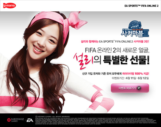 네오위즈게임즈는 자사가 서비스 중인 온라인 축구게임 '피파온라인2'(http://fifaonline.pmang.com)에서 내달 14일까지 전용구장 PC방 유저들을 대상으로 '설리가 주는 깜짝 선물' 이벤트를 진행한다.