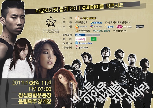 다문화 가정을 돕기 위한 슈퍼 아이돌 빅 콘서트가 오는 6월 11일 오후 7시부터 2시간 30분간 잠실종합운동장 올림픽 주경기장에서 열린다.