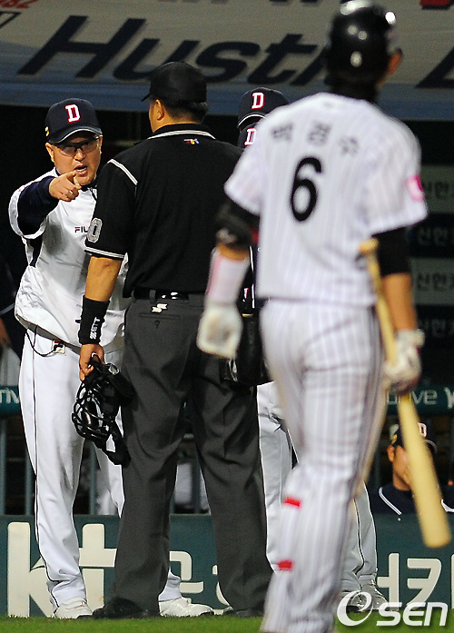 워낙 순식간에 일어난 일이었는데요. 얼핏 보기에 파울인 것 같기도 하고, 아닌 것 같기도 한 순간이었습니다. 김경문(53) 두산 감독은 곧바로 그라운드로 걸어 나와 윤상원 구심에게 항의했습니다. 공이 박경수의 방망이를 맞았으니 파울이라고 항의했습니다. 이 경우 볼은 스트라이크가 되어야 하고 2루 진루는 없었던 일이 됩니다. 처음에는 파울이 아니라는 판정을 내렸던 심판진은 잠시 회의를 가진 끝에 파울이라고 판정을 번복했습니다.