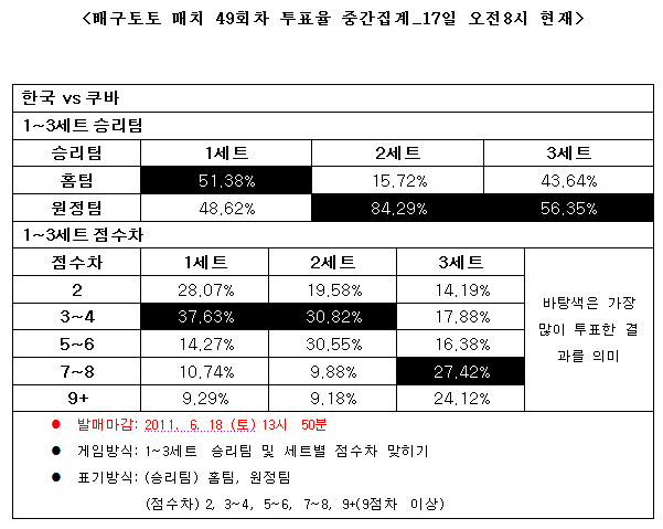 2011 월드리그 국제남자배구대회 대상 배구토토 매치 49회차 중간집계 결과