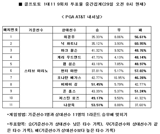 PGA AT&T 내셔널 1라운드 골프토토 1대11 9회차 투표율 중간집계