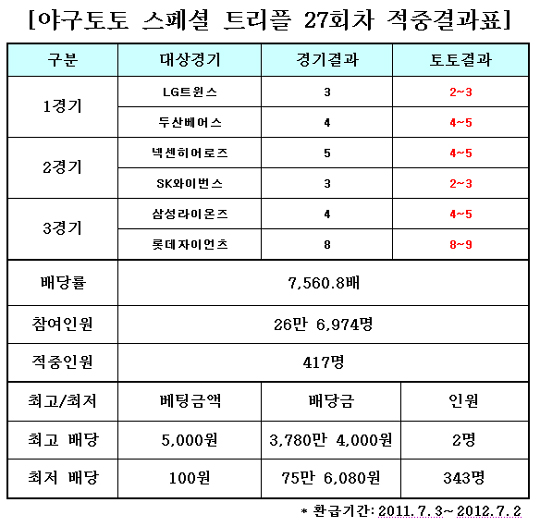2011시즌 야구토토 스페셜 트리플 27회차 적중결과