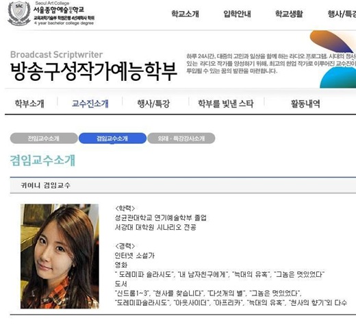 4일 오후 한 온라인 커뮤니티에는 '교수님 학점 잘 주세요'라는 제목의 사진이 올라왔다. 서울종합예술학교 방송구성작가예능학부에 귀여니가 겸임교수로 소개돼 있는 사진을 캡처해 올린 것.