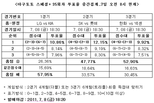 2011 프로야구 3경기 대상 야구토토 스페셜+ 35회차 투표율 중간집계