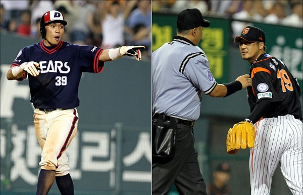 <사진2> 7월 21일 잠실 롯데전서 보크 항의 중인 이종욱과 공수교대 중인 임경완./두산 베어스 제공.