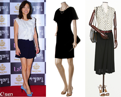 격식 있는 자리에서 가장 유연하게 활용할 수 있는 패션은 화이트 앤 블랙이다. BMK의 결혼식에서 박정현이 매치한 화이트 톱과 블랙 쇼트 팬츠는 베이직한 아이템이지만, 짧고 간결한 기장으로 발랄하고, 큐트함을 살려 연출했다. 여기에 블루컬러의 슈즈로 센스 있는 하객패션을 완성했다.