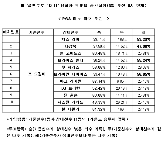 PGA 레노 타호 오픈 1라운드 대상 '골프토토 1대11' 14회차 투표율 중간집계