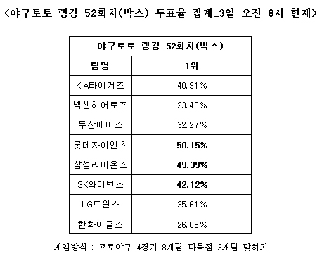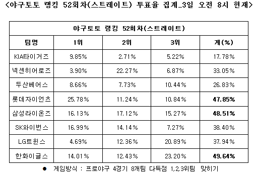 2011 프로야구 대상 야구토토 랭킹 52회차 투표율 중간집계 결과