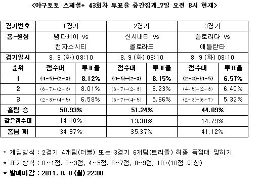 [야구토토] 국민체육진흥공단(www.kspo.or.kr)이 발행하는 체육진흥투표권 수탁사업자인 스포츠토토 공식 온라인 발매 사이트인 베트맨(www.betman.co.kr)이 오는 9일(화) 열리는 미국프로야구(MLB) 3경기를 대상으로 한 야구토토 스페셜+ 43회차 투표율을 중간집계한 결과, 국내 야구팬 50.93%는 탬파베이-캔자스시티 (1경기)전에서 홈팀 탬파베이의 승리를 예상했다.