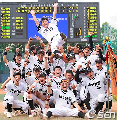 제66회 청룡기 전국고교야구선수권대회 겸 후반기 주말리그 왕중왕전 천안 북일고와 대구 상원고의 결승전 경기가 11일 오후 목동야구장에서 열렸다. 이 날 경기에서 대구 상원고가 북일고에 역전승을 거두고 청룡기를 품에안았다. 상원고는 10일 목동구장에서 열린 제 66회 전국고교야구선수권대회 겸 주말리그 왕중왕전 결승전에서 2-1로 북일고를 꺾고 1999년 우승 이후 12년 만이자 역대 5번째 청룡기 우승을 차지하며 주말리그 왕중왕에 올랐다. 경기를 마치고 상원고 박영진 감독이 헹가래를 받고 있다. / rumi@osen.co.kr