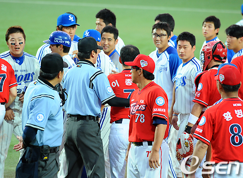 [OSEN=대구,지형준기자] 14일 오후 대구구장에서 열린 '2011 롯데카드 프로야구' 삼성 라이온즈와 KIA 타이거즈의 경기, 5회말 2사 1,2루에서 KIA 트레비스가 강판당하며 삼성 채태인과 말다툼인해 벤치 클리어링 사태가 벌어졌다. KIA 이종범이 삼성 선수들과 이야기를 나누며 각자 벤치로 웃으며 들어가고 있다. /jpnews@osen.co.kr