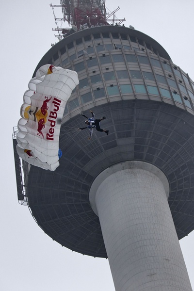 세계적 베이스 점퍼이자 레드불 에어포스에 소속되어 있는 마일즈 데이셔(42), 찰스 브라이언(41), 마이크 스완슨(38), 어설 로렌스(37), 그리고 존 디보어(36) 등 5인으로 구성 된 이벤트 팀은 최근 한국의 불안정한 기상조건에도 불구하고 N서울타워에서 깔끔한 고공낙하를 선보였다.
