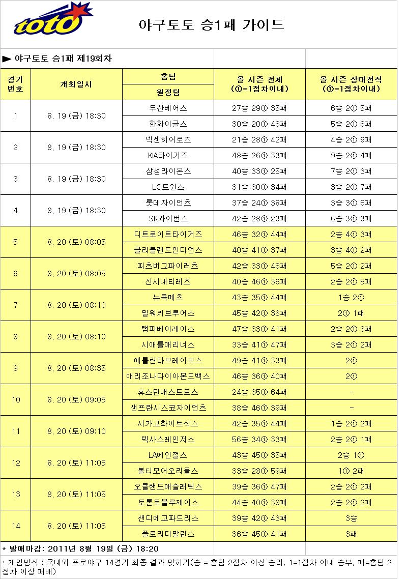한편 클리블랜드 인디언스와 디트로이트 타이거즈의 맞대결에서는 홈팀 디트로이트 승리(39.94%)가 예상됐다. 야구토토 승1패 19회차 게임은 19일 오후 6시 20분에 발매가 마감된다.