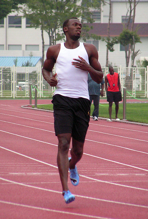 볼트는 직선주로 80m를 두 명의 동료들과 힘차게 달린 후 스타트지점으로 걸어서 돌아가는 훈련을 8회 정도 반복했다. 가벼운 러닝훈련이었지만 볼트의 폭발적인 스피드와 가속도를 확인할 수 있었다. 어느 정도 몸이 풀리자 하얀색 러닝셔츠만 입고 본격적으로 뛰기 시작했다. 워낙 체격이 좋고 보폭이 넓은 덕에 80 m를 순식간에 질주했다.