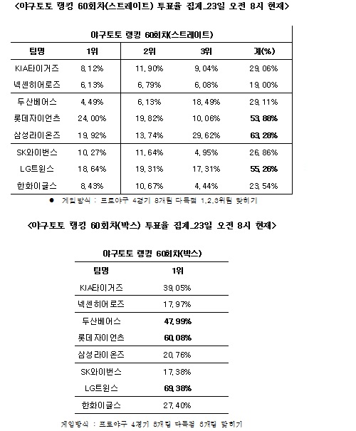 국민체육진흥공단(www.kspo.or.kr)이 발행하는 체육진흥투표권 수탁사업자 스포츠토토의 공식 온라인 발매 사이트 베트맨(www.betman.co.kr)이 24일(수) 열리는 2011 프로야구 4경기 8개팀을 대상으로 한 야구토토 랭킹 60회차 스트레이트 게임을 중간집계한 결과, 참가자들은 삼성(63.28%), LG (55.26%), 롯데(53.88%)순으로 다득점 상위 3개팀을 꼽았다. 반면 넥센(19.00%)과 한화(23.54%)는 다득점 가능성이 가장 낮은 팀으로 예상됐다.