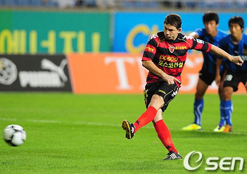 슈바-모따-아사모아로 이어지는 포항의 공격진은 경기 초반부터 거침없이 인천을 몰아쳤다. 인천은 순간적으로 당황했다. 수비가 불안해지는 것은 당연지사. 실수도 쉽게 나왔다. 전반 5분 페널티 지점으로 치고 들어가는 슈바에게 수비수 정인환이 파울을 범한 것. 주심은 곧바로 페널티킥을 선언했다. 키커로 나선 모따는 골키퍼 권정혁을 가볍게 속이고 선제골을 기록했다.