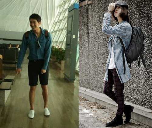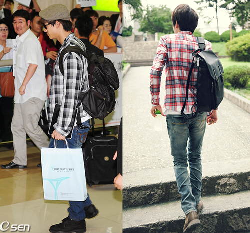 하지만 공항패션에서 택연의 스타일은 의외로 소박하다. 체크무늬 남방을 아우터처럼 걸치고 청바지와 백팩을 매치하여 마치 캠퍼스 패션을 보는 듯 하다.