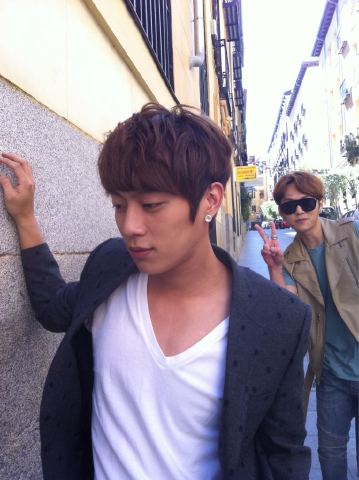 사진 속 윤두준은 길거리에 팔을 걸친 채 분위기를 잡고 있는 윤두준의 모습이 보이며 그 뒤로 장난스런 모습의 용준형이 브이를 그리고 있다.