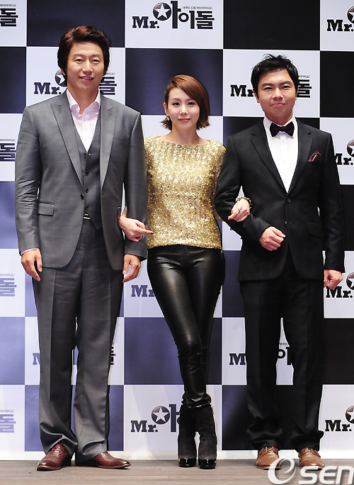 [OSEN= 백승철 인턴기자] 28일 오후 서울 건대입구 롯데시네마에서 열린 영화 'Mr.아이돌' 제작보고회에서 김수로, 박예진, 임원희가 포토타임을 갖고 있다.
