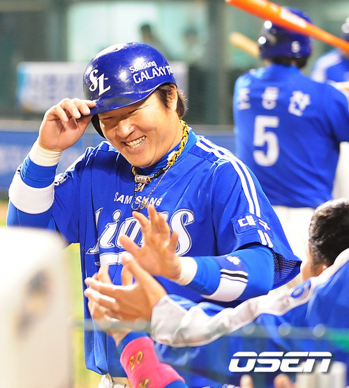 6일 오후 잠실구장에서 열린 '2011 롯데카드 프로야구' LG 트윈스와 삼성 라이온즈의 정규 시즌 마지막 경기에서 5회초 1사 주자 3루 삼성 강봉규의 중견수 앞 1타점 적시타때 홈을 밟은 최형우가 덕아웃에서 동료들과 기쁨을 나누고 있다. 이날 경기는 LG 임찬규와 삼성 장원삼이 선발 맞대결을 펼친다. 삼성 오승환은 아시아 신기록 48세이브에 도전중이다. 오승환이 48세이브로 아시아기록을 수립한다면 투수 4관왕(다승`탈삼진`평균자책점`승률)에 오른 윤석민(KIA)과 타격 3관왕(홈런`타점`장타율)이 유력한 팀 동료 최형우와의 MVP 경쟁서 유리한 고지를 차지할 수 있다. 한편 이 날 LG 박종훈 감독은 성적 부진에 대한 책임을 지고 자진 사퇴를 결정했다. / rumi@osen.co.kr