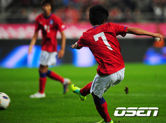홍명보 감독이 이끄는 올림픽 축구대표팀이 7일 오후 서울월드컵경기장에서 우즈베키스탄과의 친선 경기를 가졌다. 후반 한국 백성동이 팀 네번째 슛을 성공시키고 있다. 한국과 마찬가지로 올림픽 아시아 최종 예선 1차전서 승리를 거둔 우즈베키스탄은 국가대표로 발탁된 1명을 제외한 정예 선수들이 출전한다. 국가대표팀에 중복 차출돼 선수들의 공백이 생기면서 이번 올림픽 대표팀에는 20세 이하(U-20) 콜롬비아 월드컵서 활약했던 선수들이 그 자리를 대신했다. 기존의 장현수, 백성동 이외에 황도연, 김영욱, 김경중이 새롭게 이름을 올렸다. 홍명보호는 내달 23일과 27일 카타르, 사우디아라비아와의 최종예선 2,3차전을 앞두고 이번 우즈베키스탄과의 친선 경기를 통해 변수에 대한 적응력을 키울 계획이다. 이 날 A대표팀과 올림픽대표팀이 최초로 같은 날, 같은 장소에서 릴레이 매치를 벌인다. / rumi@osen.co.kr